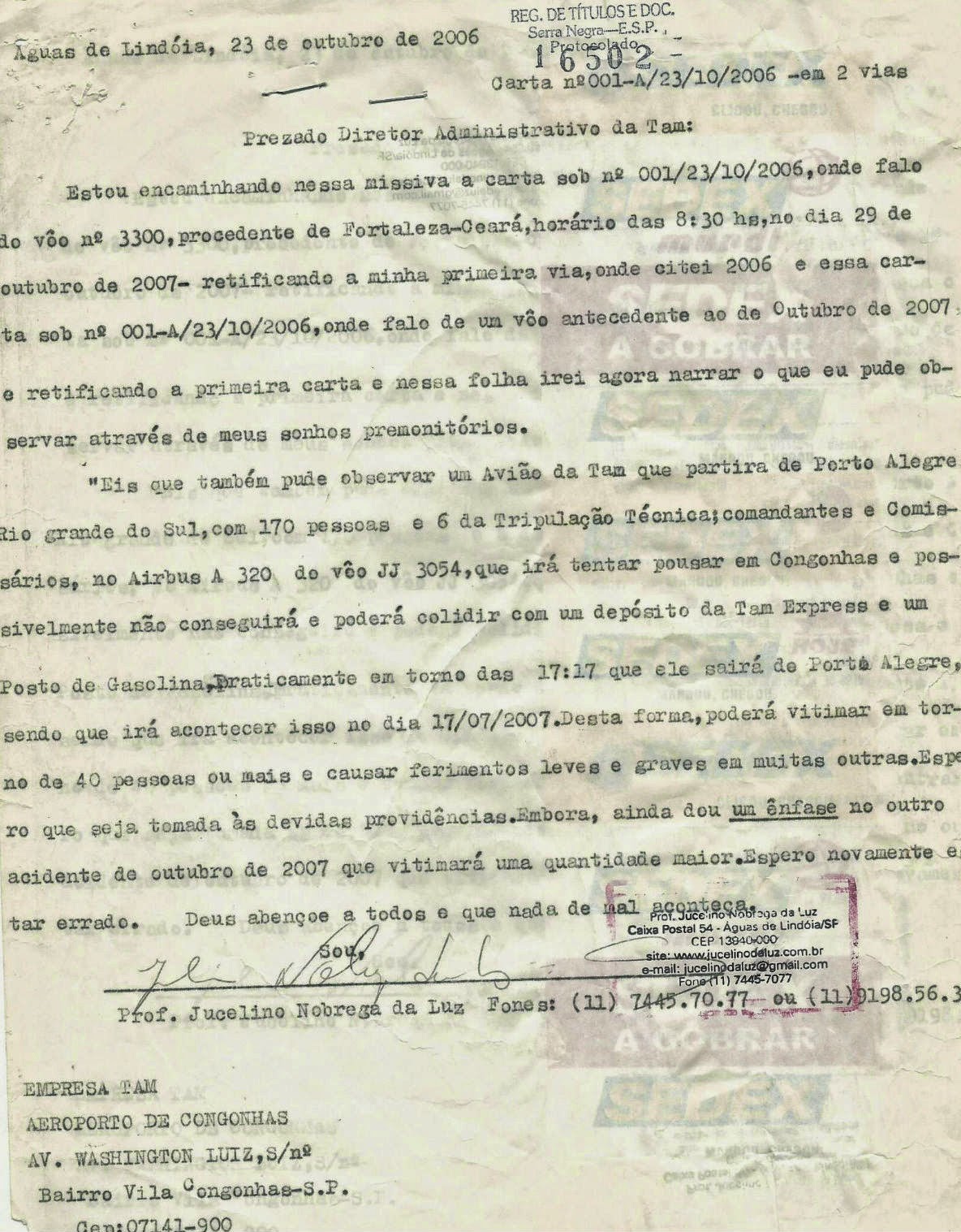 TAM3054便は、TAM航空により運行されていました。その便は、ブラジル南部のポルトアレグレからサンパウロを結ぶ国内線で、同機はエアバス社製の旅客機で、機体記号PR-MBK・型式A320-233でした。ジュセリーノ・ルースは、事故を未然に防ぐために数通の手紙を送りました。やり取りの中で、ブラジル航空の秘書は郵送したその手紙が実際にジュセリーノ・ルースによって書かれたかを確かめるために彼に電話をくれました。2007年7月17日、機体はサンパウロのコンゴニャス国際空港の滑走路35Lへ着陸しました。しかし、その直後に滑走路を左にそれてオーバーランし、ワシントン・ルイス大通り(以下、「WL通り」)の反対側へ飛び出しました。その上、道路を横切った挙句、滑走路17R近くのTAMエクスプレス・ビル(貨物取扱所:以下、「TMAビル」)に衝突しました。この事故で乗員乗客187名全員と地上にいた12名が亡くなりました。このTAM3054便オーバーラン事故は、2009年5月31日にアントニオ・カルロス・ジョビン国際空港発シャルル・ド・ゴール国際空港行きのエールフランス447便が航行中に大西洋上に墜落後22ケ月間で、ブラジルだけでなく南アメリカ諸国で最悪の航空事故となりました。その上、エアバスA320型機による事故としては最も多くの犠牲者を出しました。エアバスA320型TAM航空3054便は、ポルトアレグレのサルガド・フィリオ国際空港を午後5時16分に離陸し、サンパウロのコンゴニャス国際空港に向け出発。既に日が暮れた午後6時51分、3054便は滑走路35Lへ着陸。高速であったので、着陸後に左右のエンジンの逆噴射装置による減速ができずに、機体は滑走路の残り三分の一の芝生が敷かれたあたりを左へそれ、滑走路から飛び出しました。そして、空港に隣接しているWL大通り上空を横切った後に、ガソリンスタンドの一部にぶつかり、WL大通り反対側にあるTAMビルに激突。WL大通り上空を横切った時に、数台の車の屋根にもぶつかりました。着陸時に「満タン」の燃料を搭載していたこと、そして4階建てのTAMビルに突っ込んだ衝撃が主な原因で、事故現場は炎上。火災発生がTAMビルの構造を弱め、その後ビルは崩壊。墜落時、同機がポルトアレグレからブラジルのサンパウロまで行くのに必要以上の燃料を搭載していたことが、爆発と地上のTAMビルの炎上を招きました。過剰な灯油が燃料タンクにあるのは、航空法に反していませんが、ブラジルの主要航空各社では比較的よくあることで、さらなる不必要な危険を招くだけです。有名な犯罪科学捜査専門家の一人でブラジルから来たレジナルド・ティロティーは、ジュセリーノ・ルースからTMA航空に送られた手紙を分析し、手紙に記された内容の信憑性を支持し、ここに添付されている専門的な報告書を発行しました。事故後、TMA航空はポルトアレグレとサンパウロを結ぶ国内線の便名を変えました。JJ 3054便の表示をやめ、JJ 3046便としました。乗員乗客187人全員がTMAビルへの衝突で亡くなりました。11名のTMAビルで働いていた人々と隣のガソリンスタンドにいたタクシー運転手もその衝突で死亡し、この事故の犠牲者は199人となりまし た。